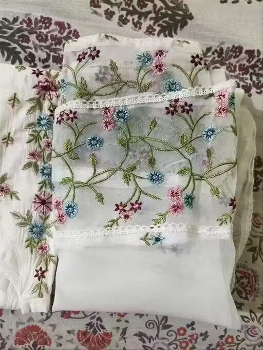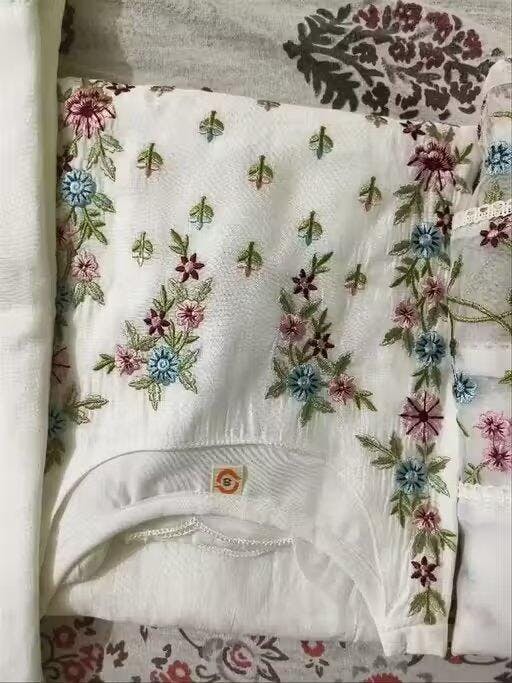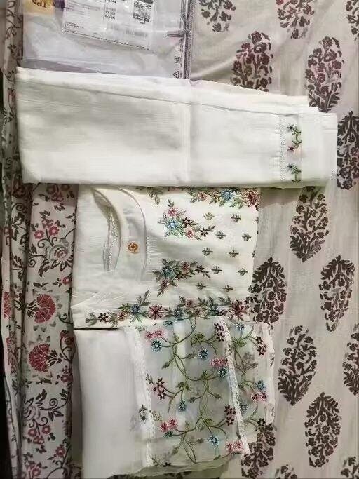 Top (Kurti): Fabric: Viscose Chanderi Work: Intricate Embroidery Length: 45 inches Bottom (Pant): Fabric: Viscose Chanderi Work: Plain Style: Straight-cut...